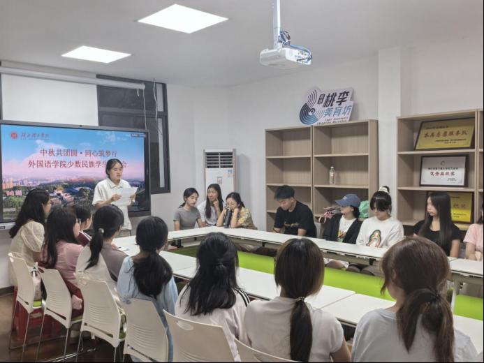 “中秋共团圆,同心筑梦行”9月28日下午,外国语学院在求知社区201室开展少数民族学生代表座谈会,学院领导班子成员、辅导员和来自土家族、苗族、壮族、回族等不同民族的二十多名学生齐聚一堂、共庆中秋,共话情谊。学院党总支书记占赢介绍了学院少数民族学生的总体情况,强调少数民族学生是学院大家庭的重要组成部分,同时结合学生实际需求,就学生关心的问题进行解答。随后,各民族学生分别就各自的民族文化、饮食习惯、在校学习生活情况及遇到的问题进行分享交流;畲族、土家族的学长、学姐代表从学习、生活等方面进行经验分享、少数民族故事讲解。
